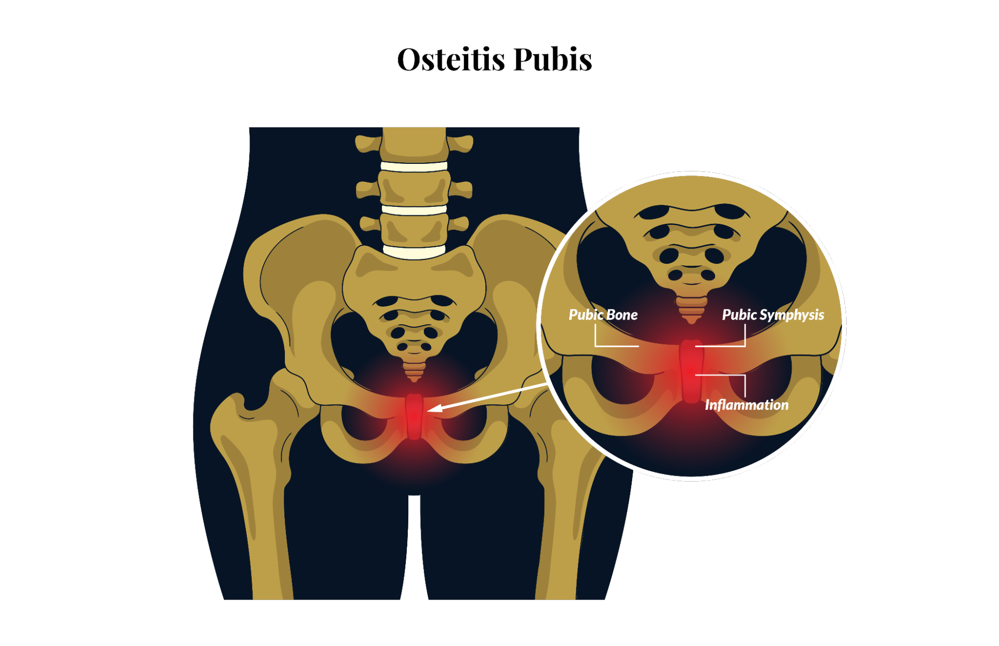 Osteitis pubis is an inflammatory condition affecting the pubic symphysis, the joint at the front of the pelvis where the two pubic bones meet.